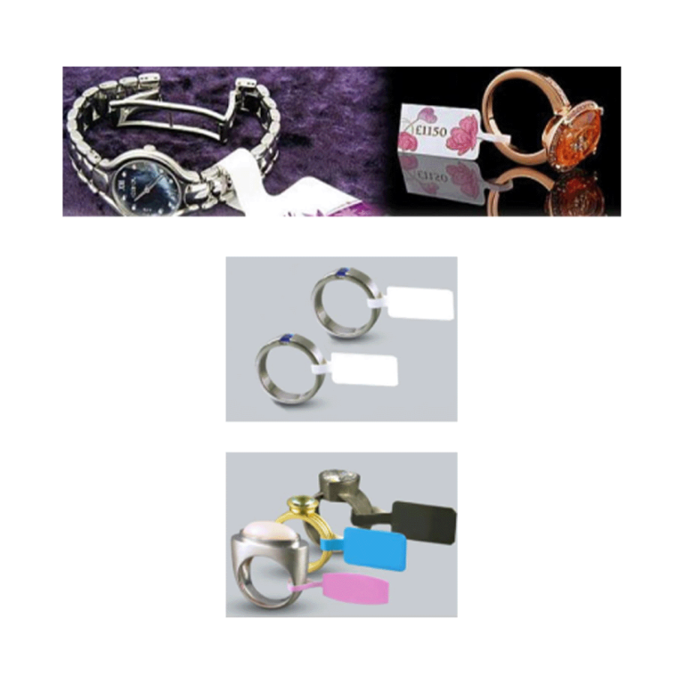 Etichette con spadino, a bandiera, a sigillo per gioielli, occhiali e cristalleria, realizzati in un materiale (…)